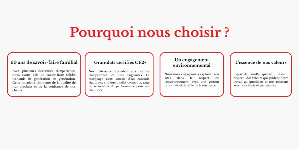 Découvrez notre gamme de sables et granulats issus de nos différents sites d’exploitation, conçus pour vos projets. La disponibilité varie selon les sites et les stocks. Téléchargez notre catalogue PDF pour consulter tous nos produits. Pour des demandes spécifiques ou des volumes particuliers, contactez-nous directement.